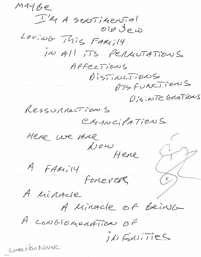 Our families have been entwined in various ways, at various times. Brunch with Florence, car shows with Harold, river rafting with Edith, partying with Meryl and Mark, and so on. You’ve known our sisters, my mom, some cousins. We’ve shared our various pals, too. And your wonderful Japanese guests back when, your other international visitors more recently. Even our special dates have meshed in April: my birthday, our anniversary, Barbara’s birthday, Janet’s birthday, Ian’s birthday, Sam’s birthday, those last four on consecutive days, and Jesse’s birthday brings it home.
